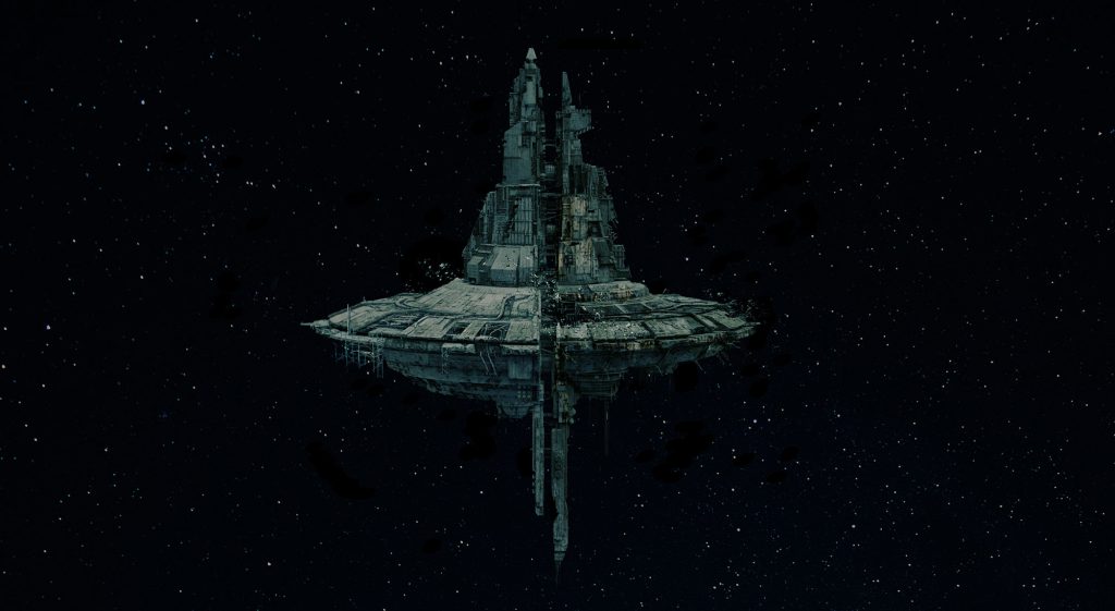 Under this ethos, the main challenge for Sepulveda-Fauser, as well as production visual effects supervisor Eric Barba, was matching ILM’s visual effects to Legacy’s practical work; if they were successful, audiences would not be able to tell where one stopped and the other started. This includes not just creatures, but sets and starships. Álvarez had the model shop create miniatures of the Corbelan ship, research center, and the EV, which Sepulveda-Fauser used to create digital replicas for the movie. “The tricky part was keeping the character of a practical model in the close-ups,” he notes.
