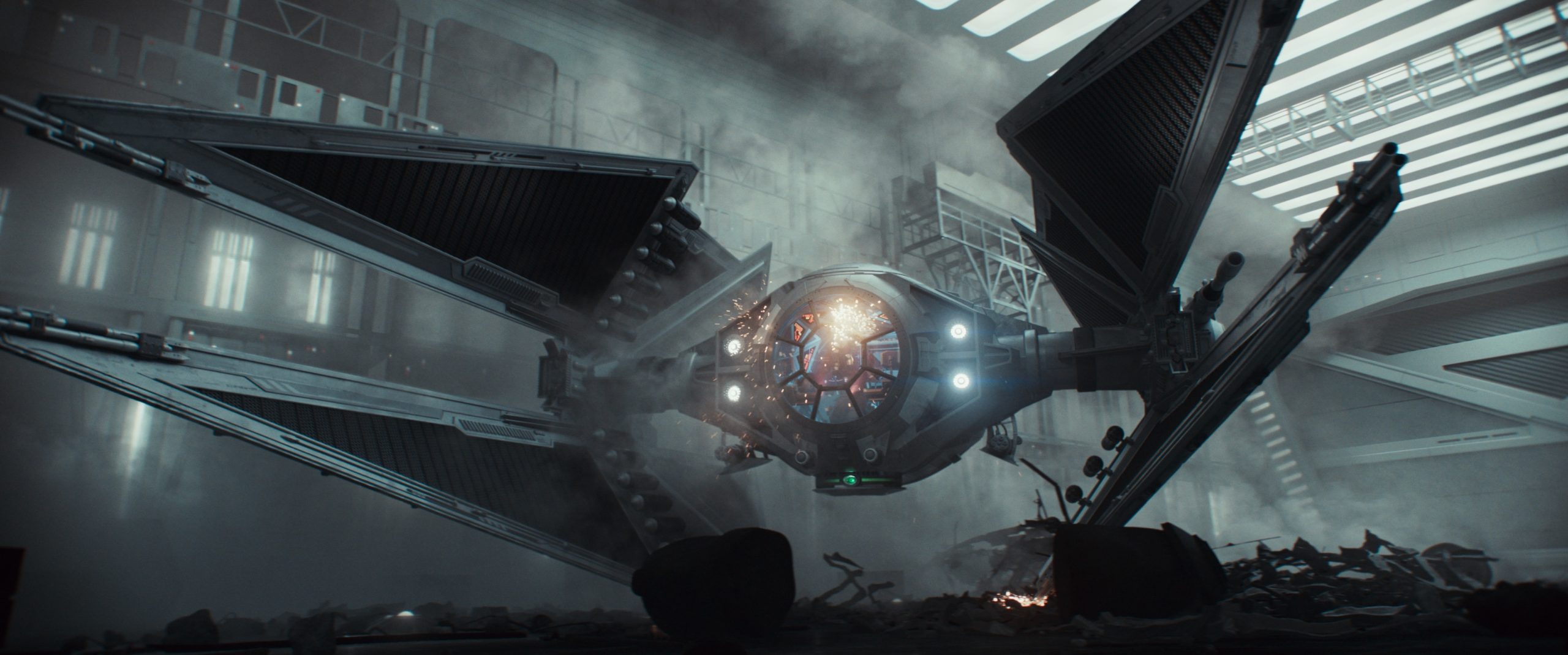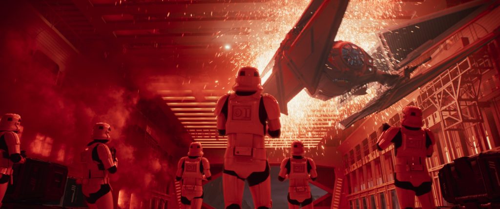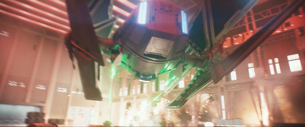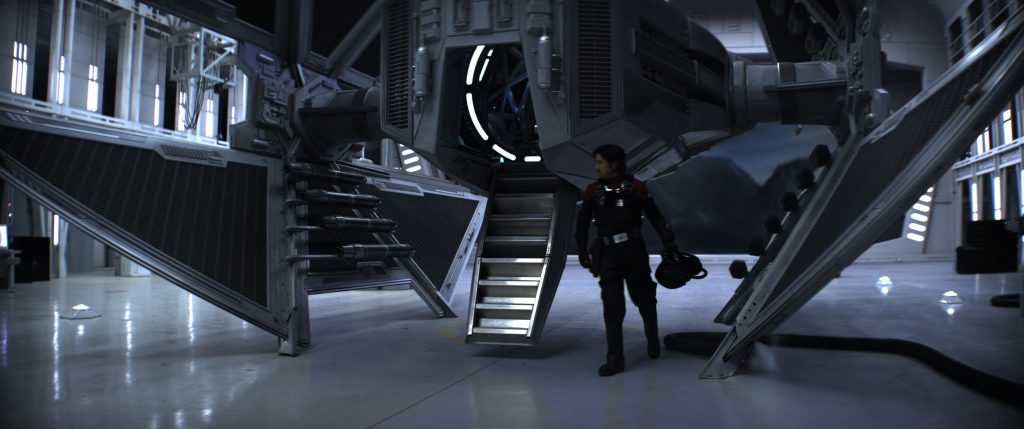 That level of realism was reflected in animation supervisor Mathieu Vig’s mission to make the Avenger look “heavy and dangerous, and as if it’s made of metal, not just pixels.” Having the Avenger scrape along the deck helped achieve this. “We’re used to seeing them [TIE fighters] flying very gracefully,” Vig explains. “Usually, we don’t animate them bumping around, so setting the weight is harder than you might think. In a hangar setting, there are so many physical elements to consider, such as the actor in the cockpit doing specific movements that we have to take into account. All of this is a carefully interlocking puzzle.”