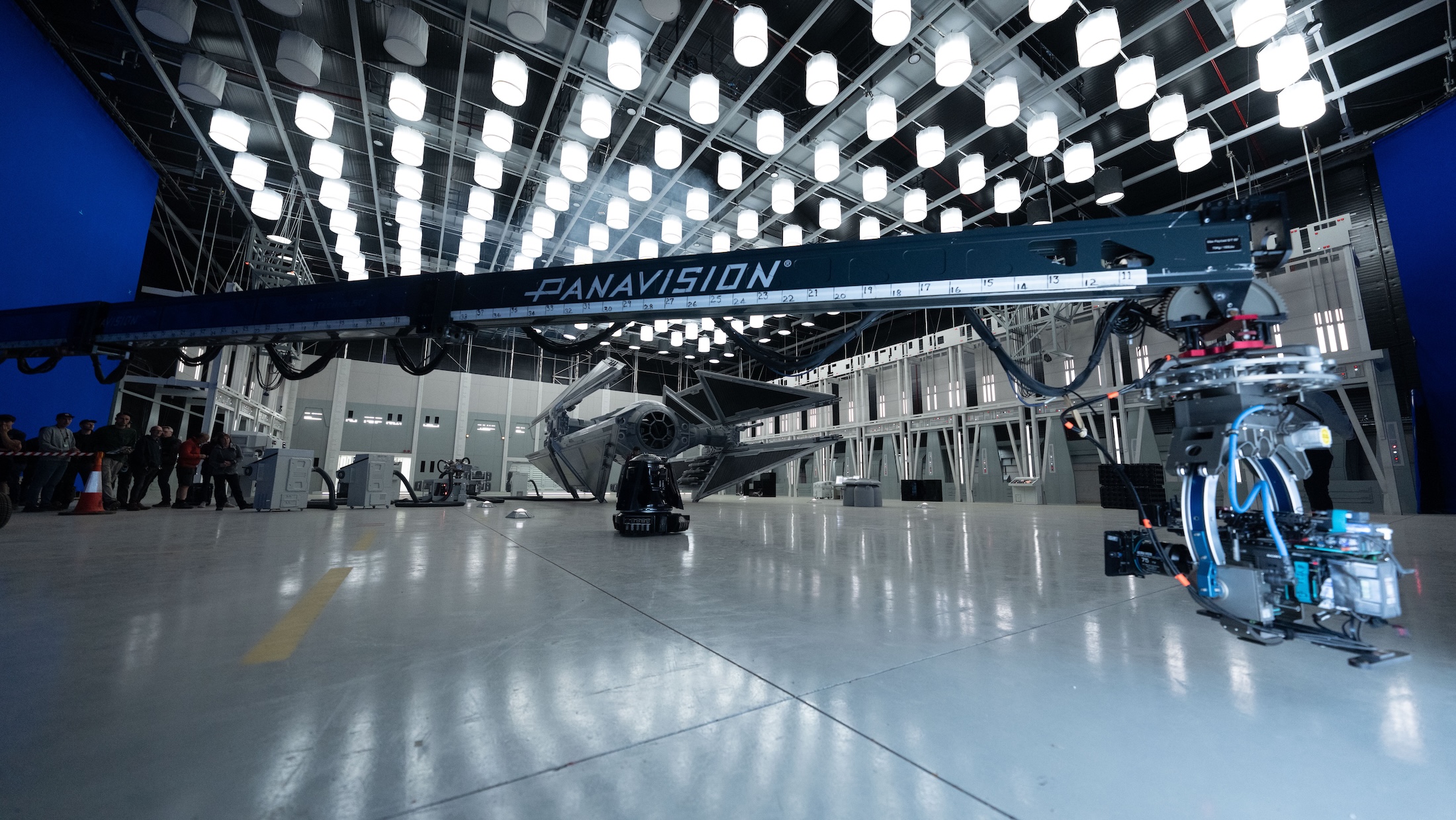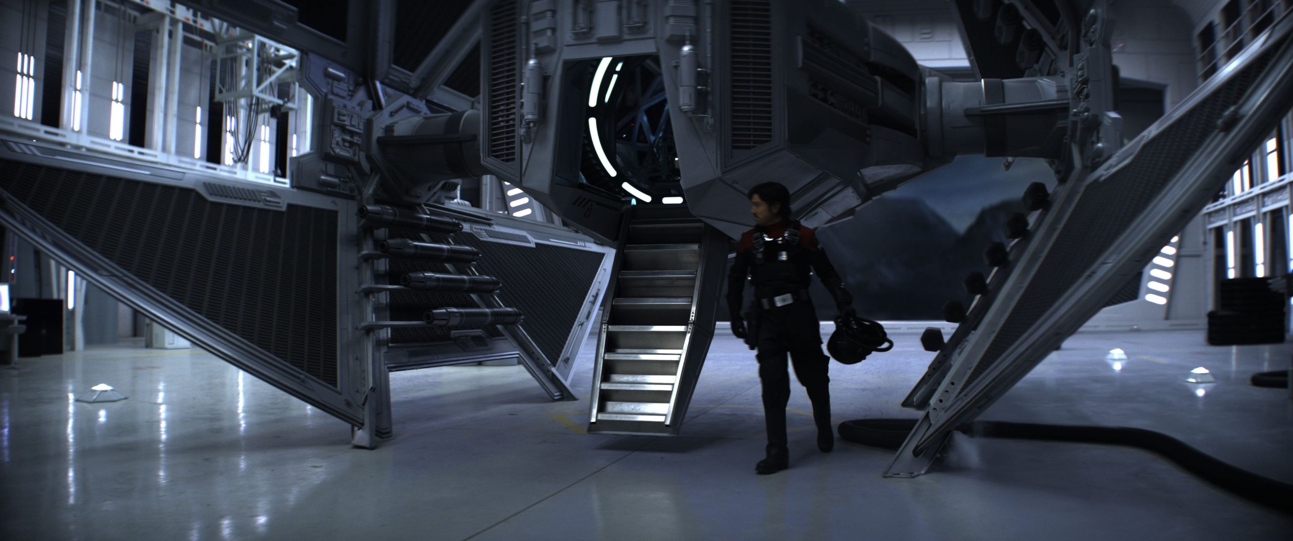 Compositing supervisor Claudio Bassi concurs, believing that the practical effects supplied ILM with valuable reference for lighting purposes. Bassi also states that, despite the presence of the practical Avenger, the TIE’s wings during Niya’s (Rachelle Diedericks) inspection are actually CG. “The hangar set didn’t have a roof, so we often replaced the wings as it was easier to integrate the CG roof.” Although the hangar set was extremely large, Pritchard highlights the fact that ILM had to extend the hangar to an even greater width, and the entirety of the front section that opens toward the snowy exterior is also CG.