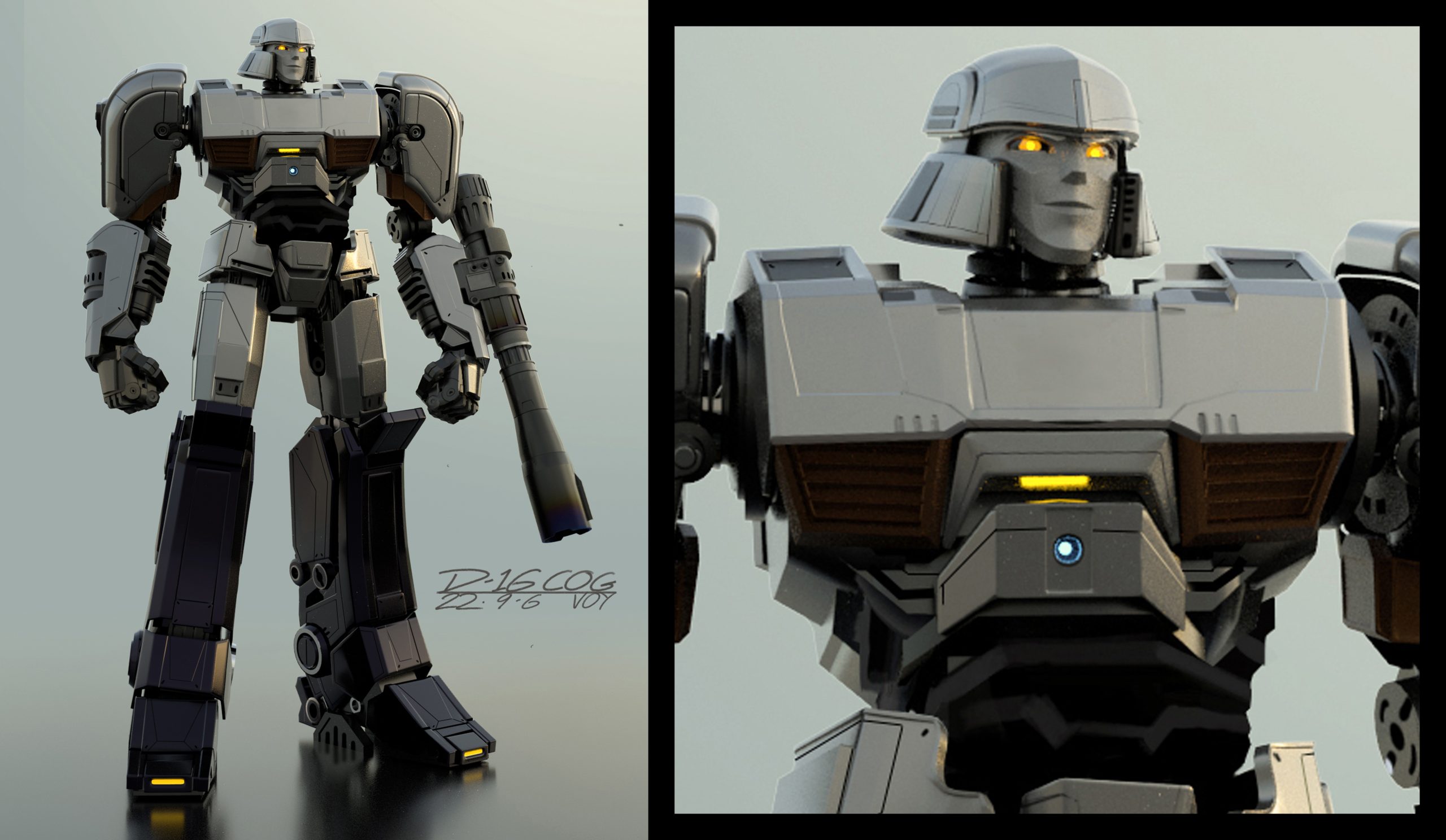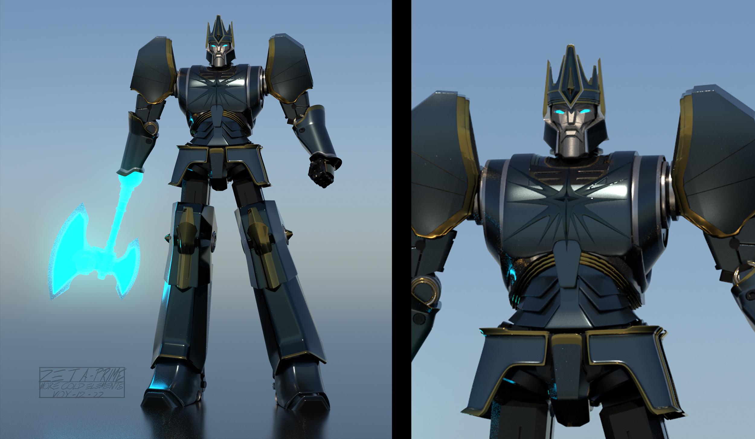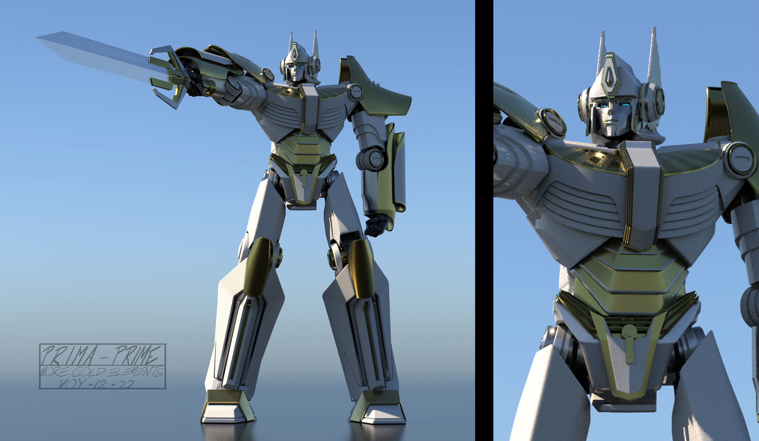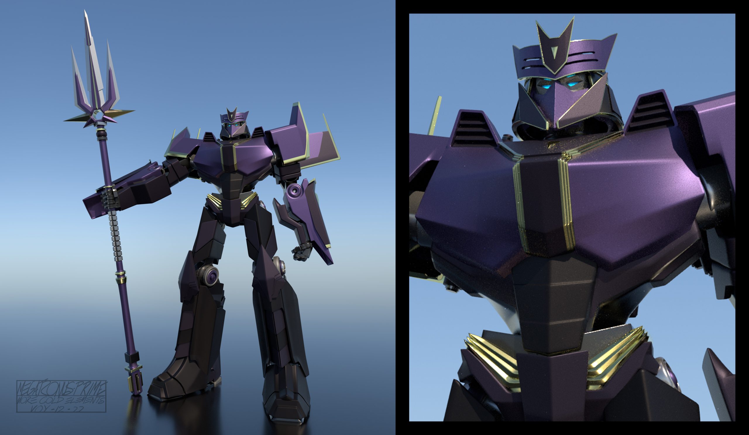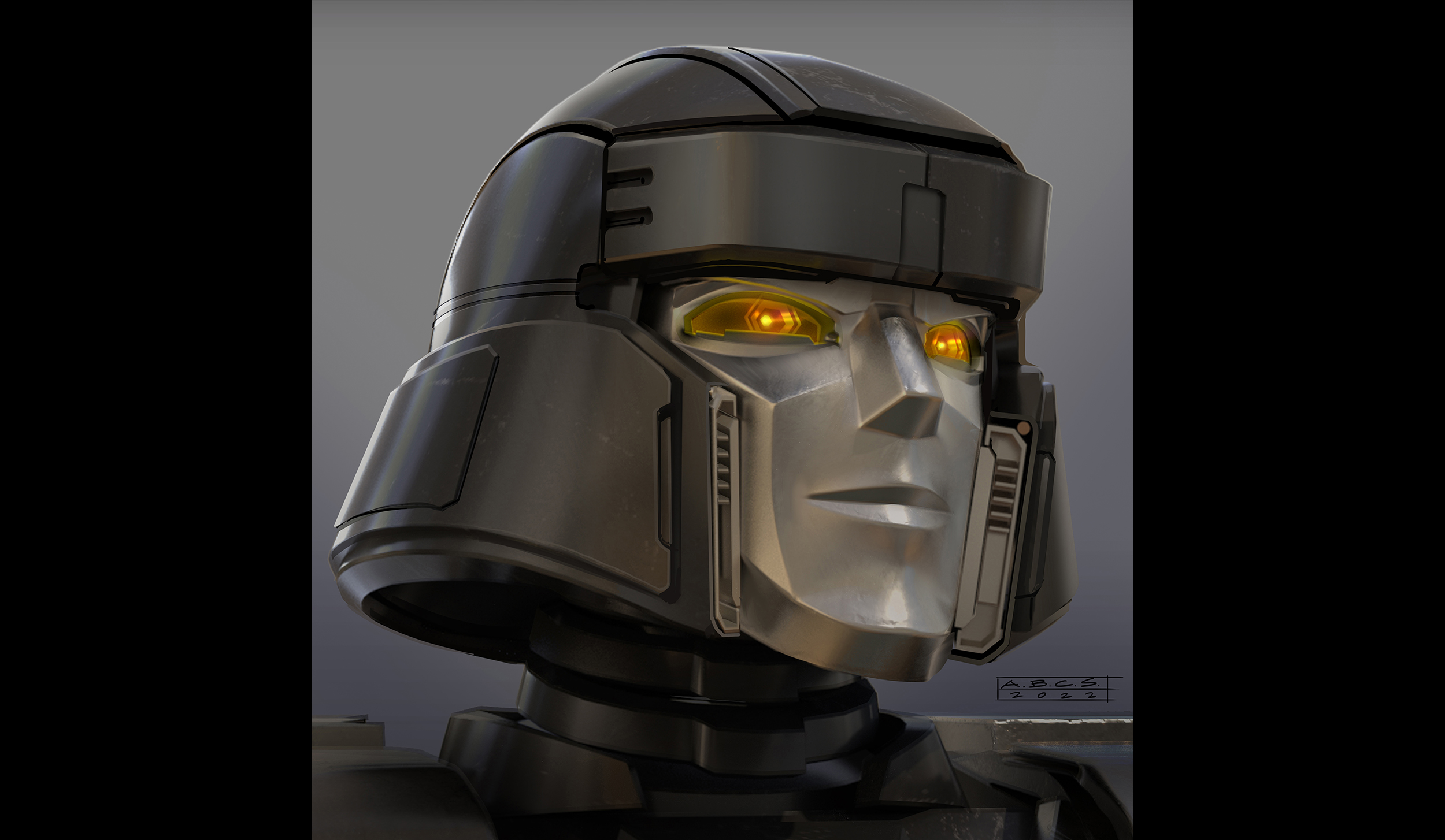 For Transformers One, the art department aimed to create shapes and silhouettes that appeared clean and simple from a distance, yet included intricate, purposeful details up-close, such as cut lines in the panels, smaller inset geometry, and layered panel work. Given that iconic Transformer designs often stem from their helmet shapes, the art department worked to seamlessly integrate faces into the helmets, enhancing their expressiveness while maintaining a mechanical, rigid aesthetic.