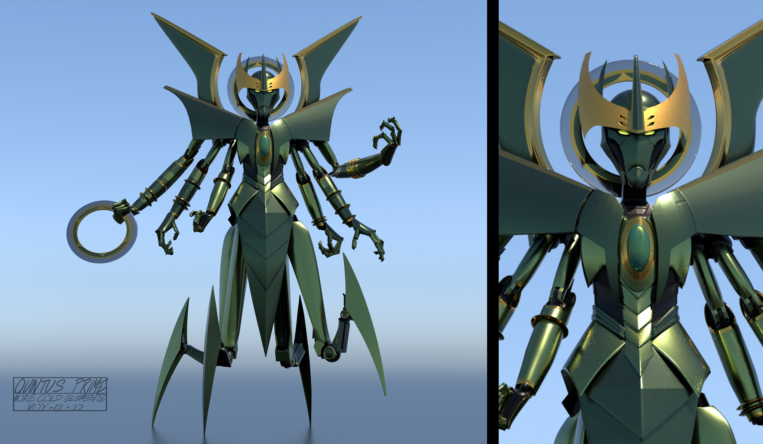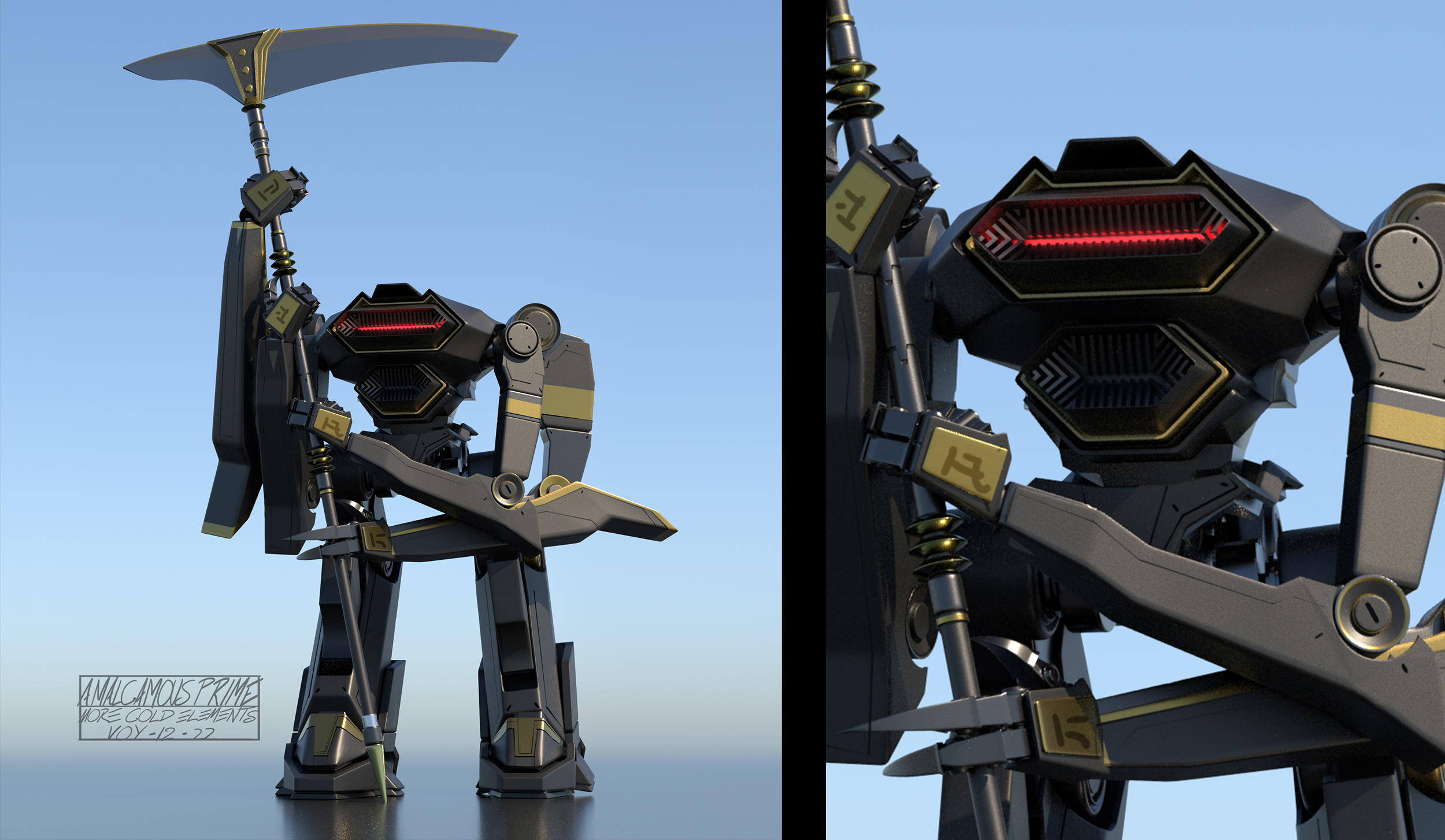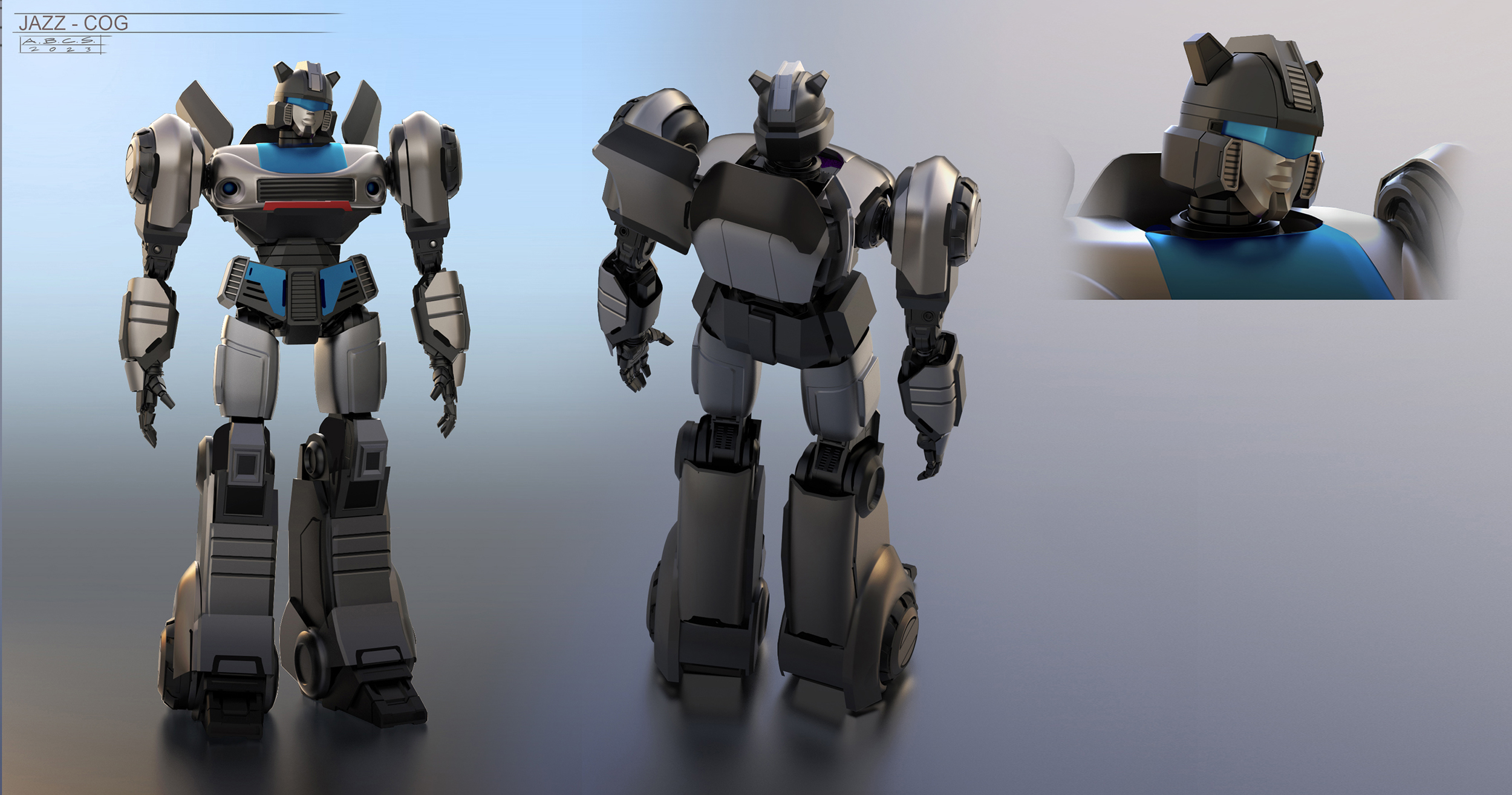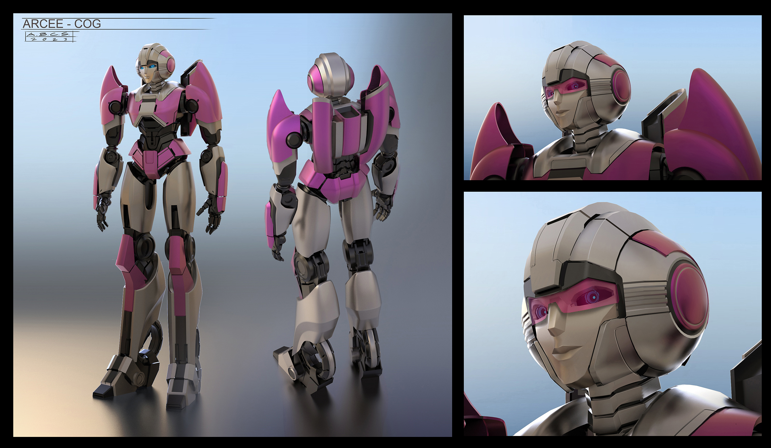 For Transformers One, the art department aimed to create shapes and silhouettes that appeared clean and simple from a distance, yet included intricate, purposeful details up-close, such as cut lines in the panels, smaller inset geometry, and layered panel work. Given that iconic Transformer designs often stem from their helmet shapes, the art department worked to seamlessly integrate faces into the helmets, enhancing their expressiveness while maintaining a mechanical, rigid aesthetic.