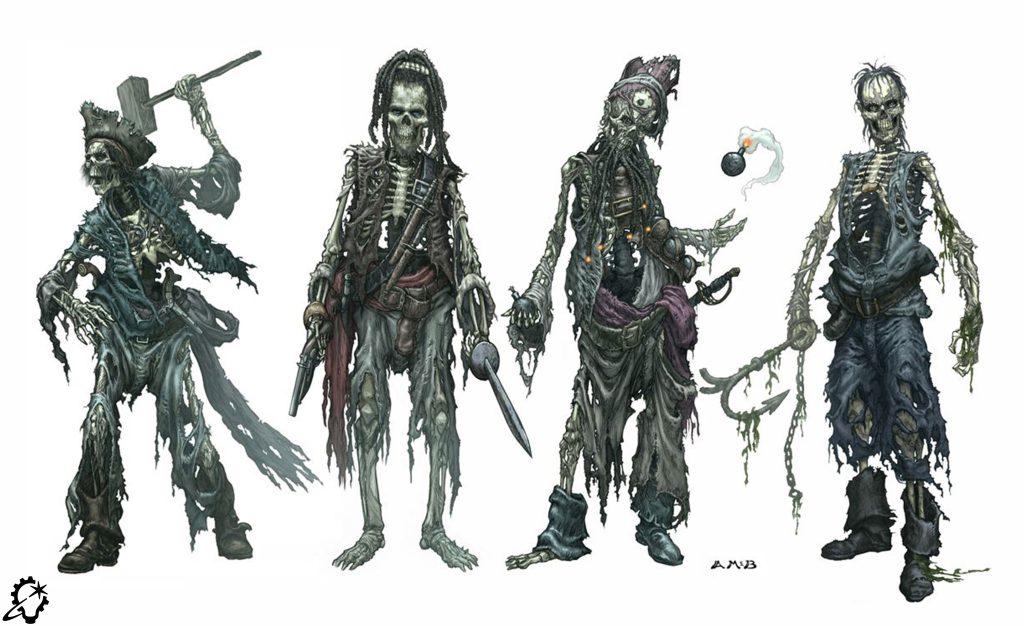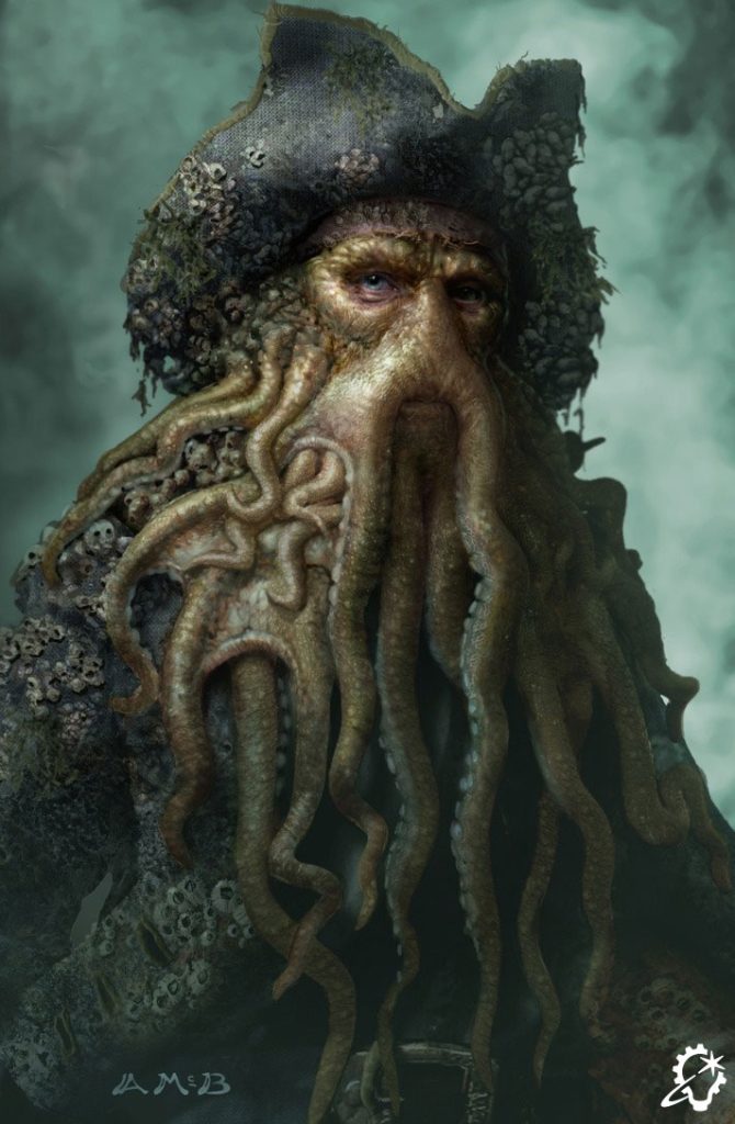 Along with Photoshop’s availability, concept artists continued drawing with traditional tools like pencils, markers, and paper until ILM received the call for Pirates of the Caribbean: The Curse of the Black Pearl (2003). “The director, Gore Verbinski, was like, ‘These are great drawings, but I want to see what it looks like in my film. Don’t give me a pencil sketch,’” Nakabayashi says. The filmmakers wanted a desiccated – but not bloody or gory – aesthetic for the cursed pirates, so Aaron McBride test-photographed beef, turkey, and salmon jerky.