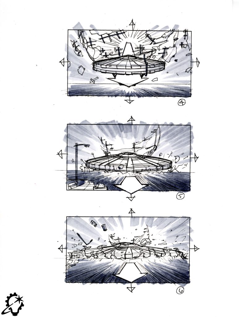 While concept art focuses on design, storyboards define the action that occurs on-screen. “Storyboards are all about the cinematic motion, the energy of a visual effects shot. That’s why ILM’s Joe Johnston was such a great foundation for this department. He would draw storyboards with arrows that would be compressed in perspective, and you really understood the depth of what he was trying to say,” Nakabayashi notes. Over time, the advent of digital animatics altered the use of storyboards. “We hardly storyboard anymore these days because animatics act as the filler, but it’s the same principle.”
