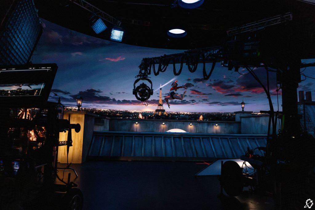 The volume itself can be adapted to any size, its “tiles” – LED panels – adjusted to the needed shape of a given set. Created by ILM’s virtual production team based in San Francisco, the entire infrastructure is built to move, “like a set-up for a rock concert,” as Milham puts it. For the Paris Olympics, a roughly 180-degree curved wall was constructed to a height of approximately 25 feet. This specific production involved the extensive use of foreground set pieces that needed to blend seamlessly with the virtual background, as did the elaborate practical lighting set-ups.