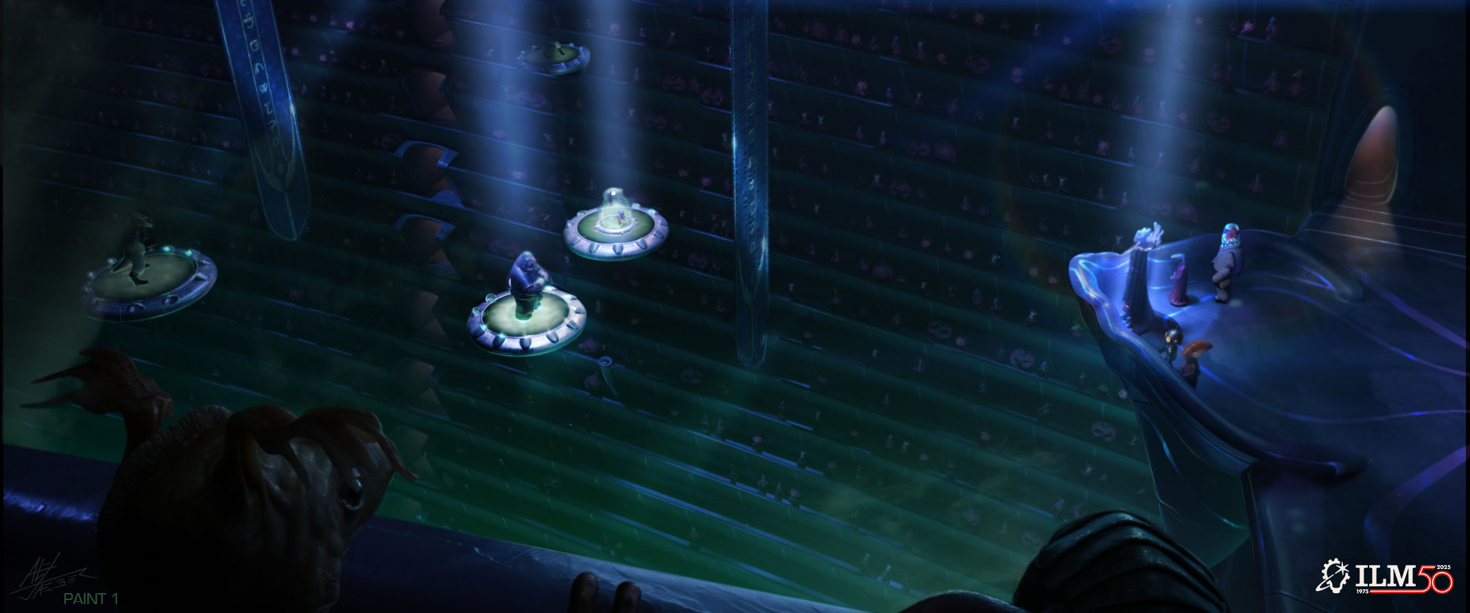 Gramstad: This concept was tackling two key problems for this scene. What should our balance be between Chris Sanders’s soriginal visual style and the limitations of live action expectations? At the same time, we could use this image to give practical design guidance for the environment team on how to stage the podium space so that the window both frames and provides value contrast to the Grand Councilwoman’s head for our primary focal point.