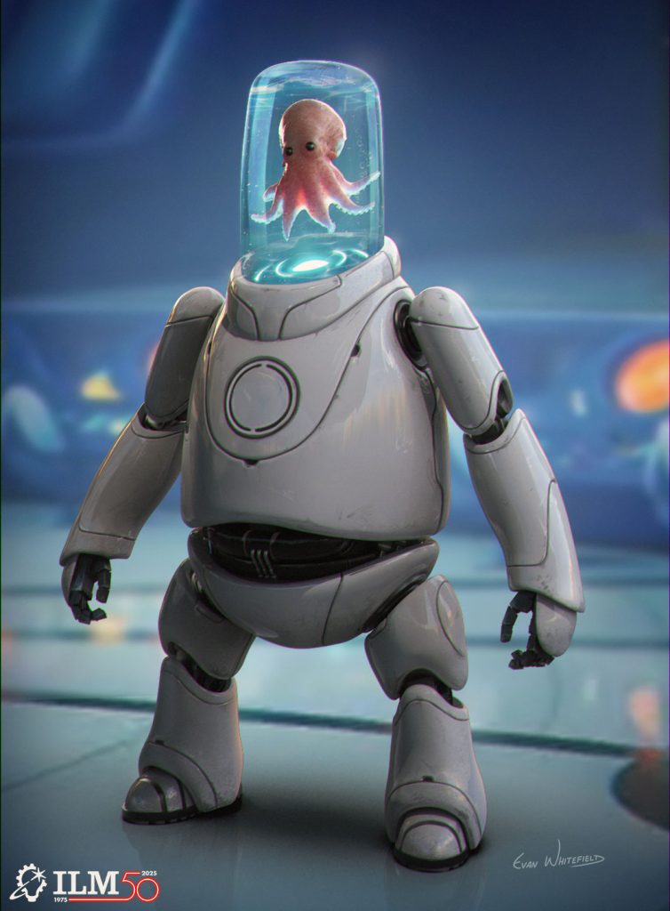 When I first started exploring the design, my goal was to go all out with the initial concepts to really push the creativity and explore extreme ideas without limits. This helped uncover unique shapes and personalities for the squid-piloted robot. Once I had a strong range of options, I focused on pulling things back to create a more grounded, believable design that would fit seamlessly into the live-action world. That balance between bold exploration and practical refinement was key.