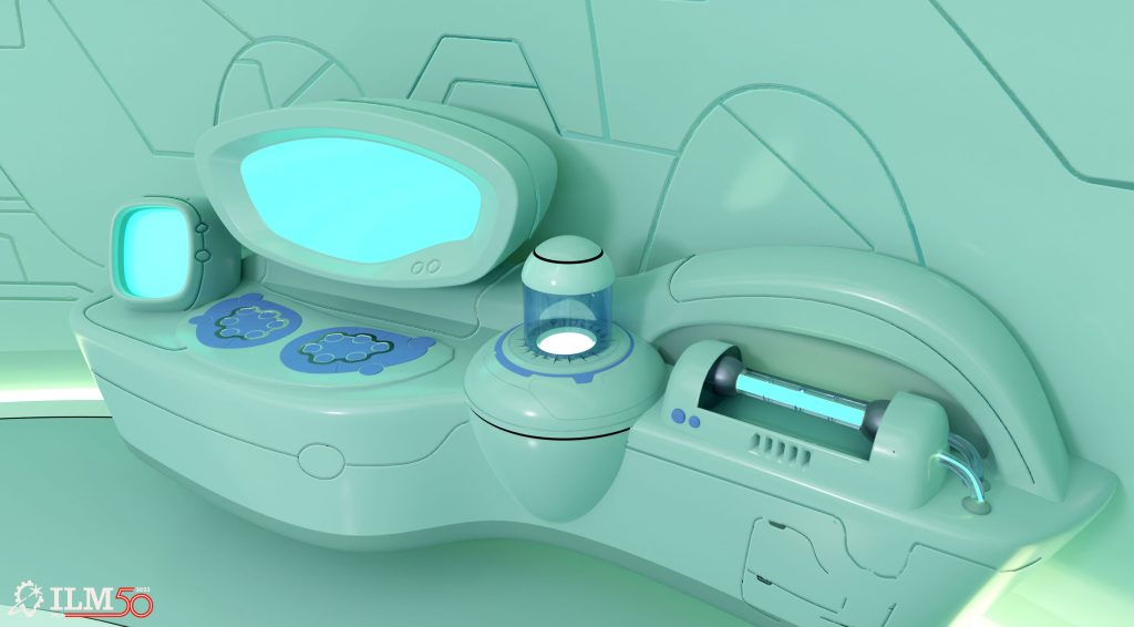 Marion: After his trial, Stitch is sent to a lab room where he is being tested upon, and from where he escapes. We needed to start from the client’s design of the room, and in the same spirit, expand a workstation into a DNA reading machine. We came up with a few variations of designs and how it would work, based on the client’s storyboards. This one is, in my opinion, the most successful.