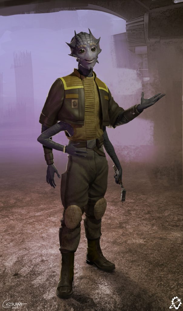 Volo is our main/player character, and there were a few different physical traits they had to have, storywise; mainly, they had to be on the smaller side for podracing prowess, and have four arms for some specific game mechanics they wanted to incorporate. Besides that, it was a very open brief.