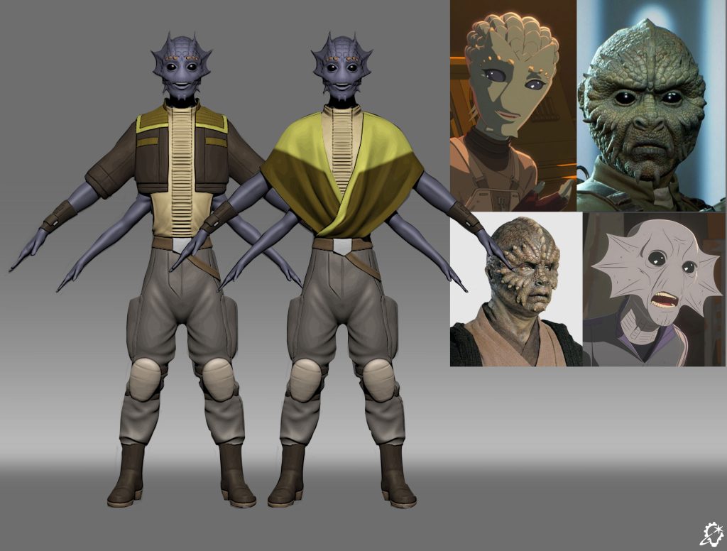 We considered multiple different species for Volo at first, lots of mulling over, lots of options that didn’t feel quite right. I proposed a Nikto, since they are such a varied species in the galaxy and have different subspecies and evolutionary traits depending on where they’re from. Maybe one subspecies evolved an extra pair of arms, which was a trait we needed. We landed there, but I don’t think we stayed there in the end, so I think Volo is something new altogether. I mostly took inspiration from previous Star Wars heroes! I wanted Volo to be very appealing, like you’d want to be their friend after you spend enough time following their story. I did a lot of additional drawings of Volo to find their mannerisms and expressions, the little things that make them, them.