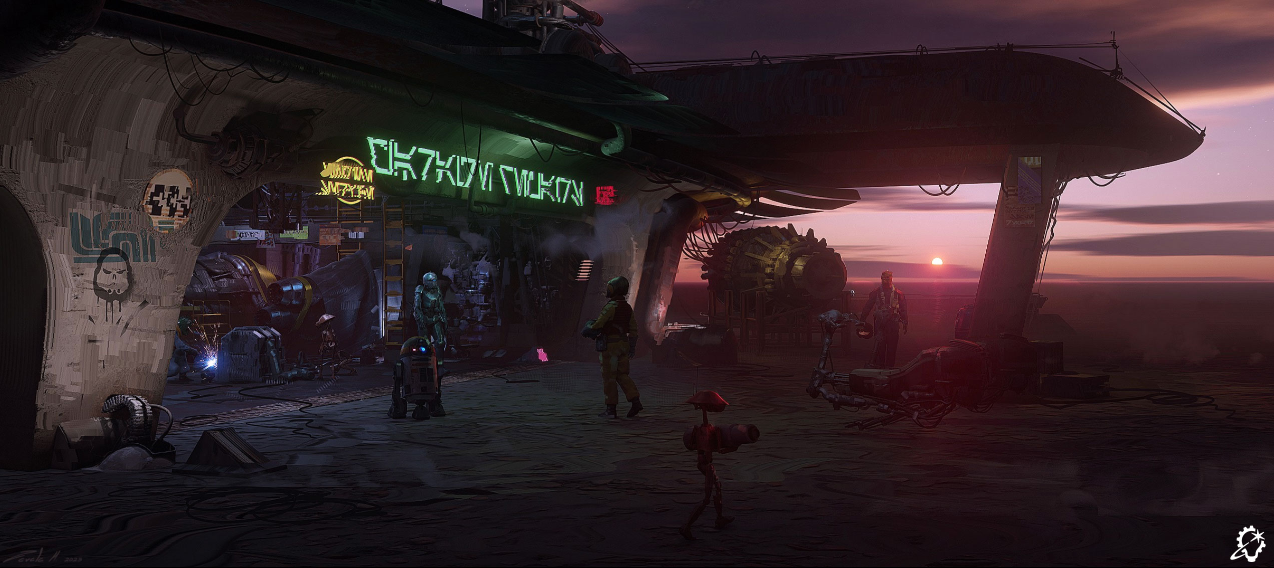 The director, Jose Perez III, really wanted a place in the middle of nowhere. I tried to capture that, but it was also important to make sure it didn’t look abandoned. It’s isolated, but lots of activity happens inside the garage as well as the surrounding areas. I always liked the idea that it was a hub where all kinds of visitors would come and go, either to fuel up or repair their speeders, and bringing with them all kinds of cool stories.