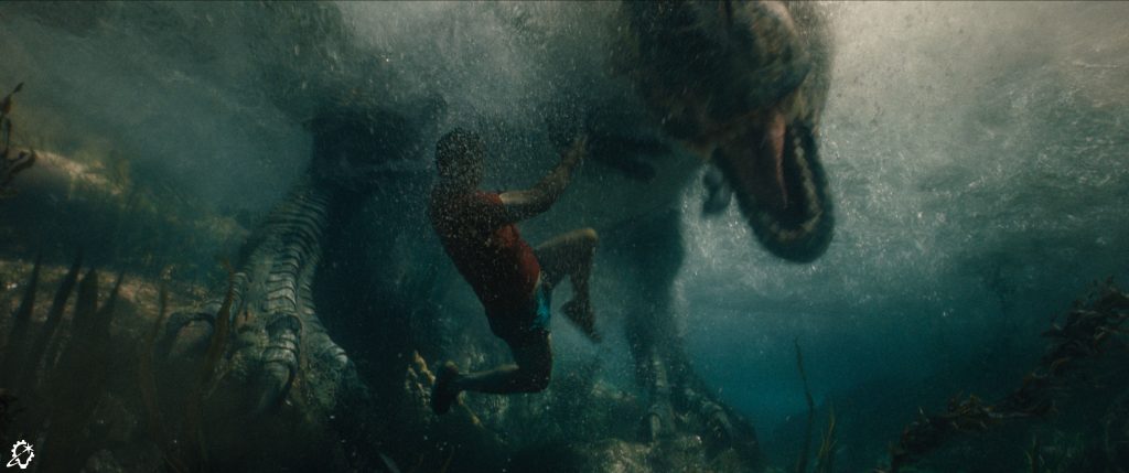 Coco’s team tackled the effects-heavy, intense action sequence where the Delgado family is chased by a just-awakened T-rex. While the river in the film is on a tropical island near the equator, these scenes were filmed at a British Olympic river course. “The T-rex interacting with the water, the digitally simulated water, and the family. It was a big, big moment,” notes Coco. “I don’t think a couple of years ago we would be able to do it because of the turnaround time needed. We had amazing effects artists who turned around the simulated water effects in record time.”