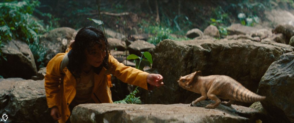 Finding real-world animal references for each dinosaur was a key part of making the movements of dinosaurs in Rebirth appear believable and anchored in reality. To create Dolores, the small Aquilops dinosaur that Isabella Delgado (Audrina Miranda) adopts as her pet, an ILM team, led by animation supervisor Delio Tramontozzi, used videos of themselves interacting with their own pet dogs and cats. “They would have multiple takes of the way their pets were responding to a laser light or picking them up in a way that allowed them to snuggle into the crook of an arm or drape over a shoulder,” says Roberts. The reference videos were submitted with animation of Dolores or other dinosaurs so Roberts and other team members could see how those real-life moments translated to animated shots in Rebirth.