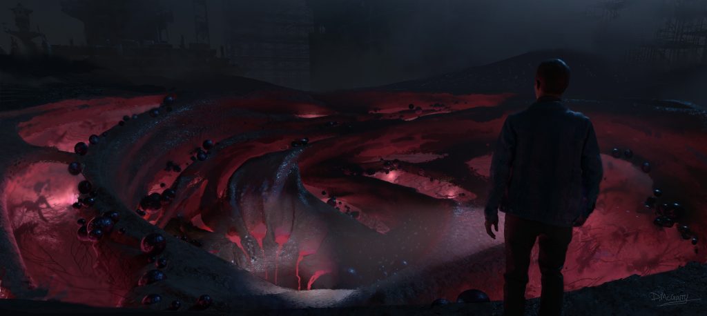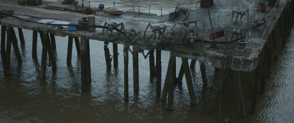 During a nighttime sequence set at a construction site, the creatures behave almost like a family gathering for dinner, ripping apart and devouring a fungus-encrusted pod for food. Behind the scenes, the ILM team came to refer to the monsters by the name “Happy.”