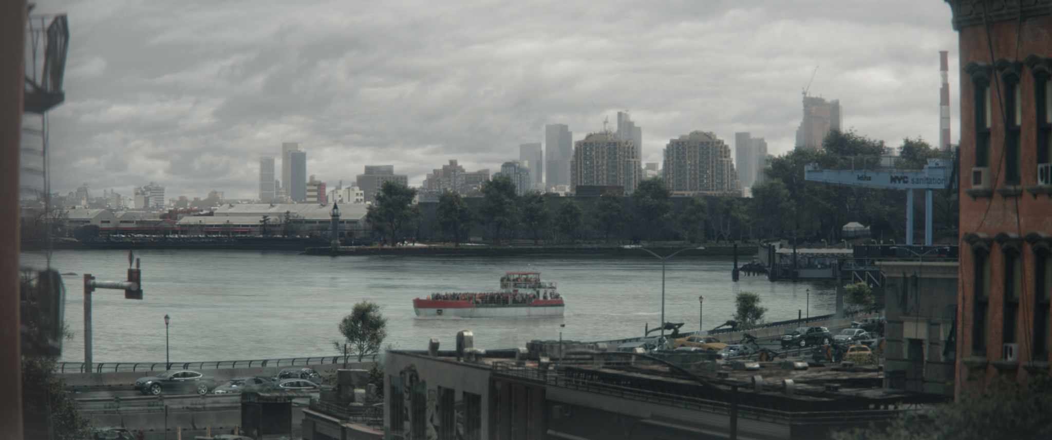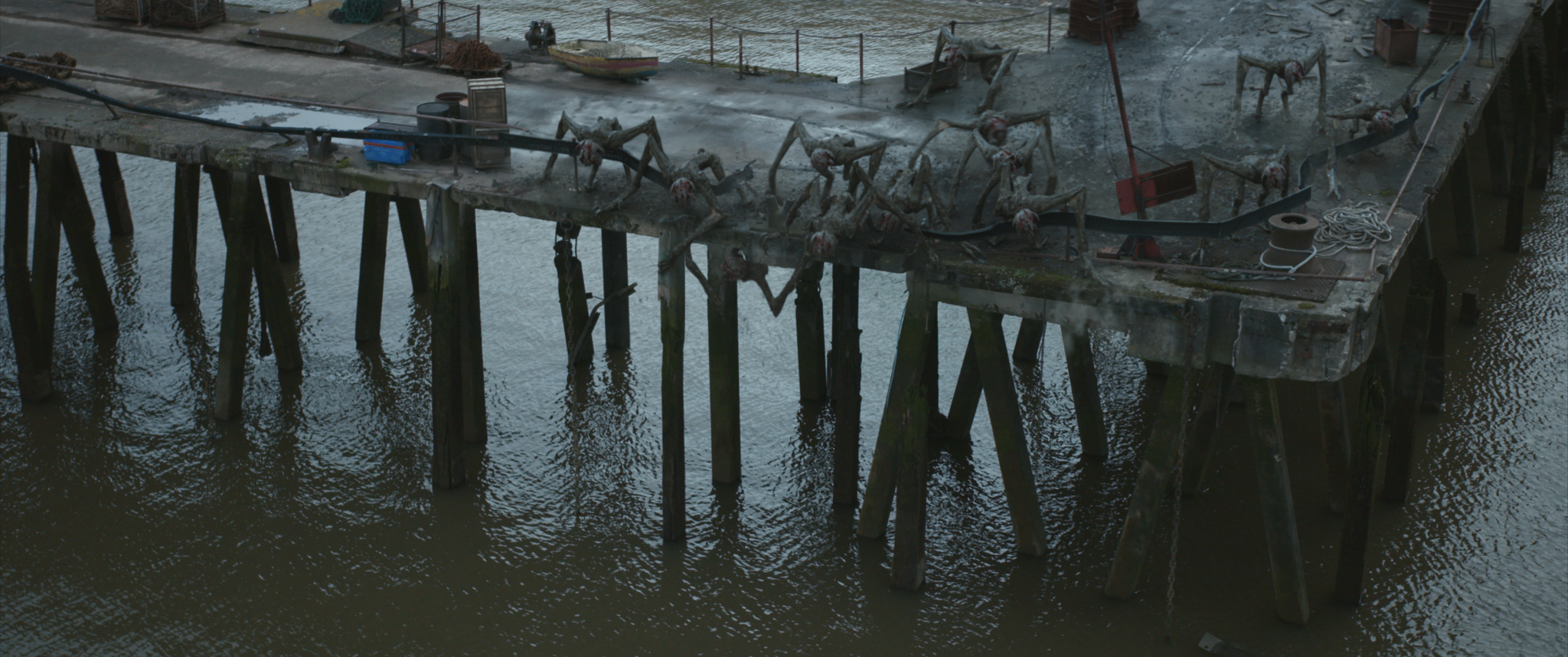 The film’s finale has Sam, Eric and Frodo desperately trying to reach a boat on the East River filled with survivors making their escape from New York. The sequence is built from several different locations, including part of an airfield dressed as a deserted FDR Drive, a pier along the Thames river, a moored boat, and a water tank at Pinewood Studios.