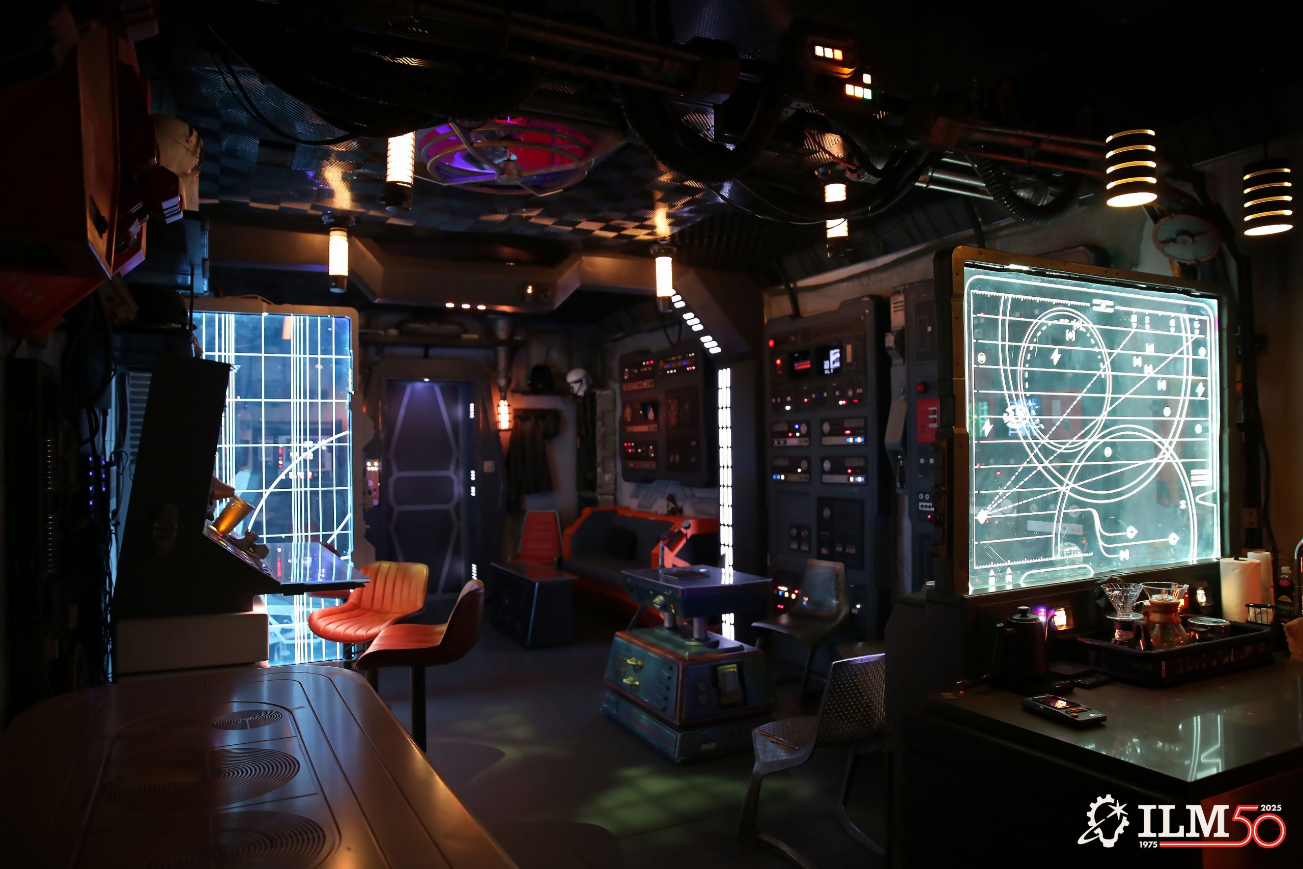 Media systems engineer Paul DeBaun, R&D principal engineer and architect Nick Rasmussen, and former AV design engineer Greg St. Germain took the lead on the audio and video systems, equipping iPads throughout the room to run everything from graphic displays to location views to static (all authentically sourced from Star Wars films). In addition to ship flybys and music features, the Hideout also includes a standard ambient soundtrack with various technological effects.