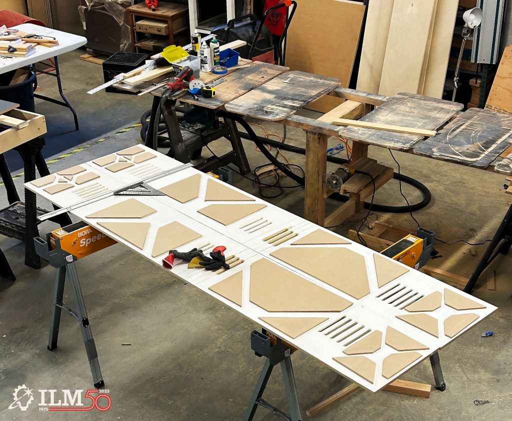 By this stage, Kyle Johnson, a former workplace services specialist with Lucasfilm, had become an integral member of the team, whom they call their “secret weapon.” An experienced craftsman, designer, and set builder, Johnson took the lead in rebuilding, fabricating, and installing a number of details throughout the room, not least of which included a massive Imperial archway that forms a key focal point, helping to break up the standard 90-degree angles in the space.