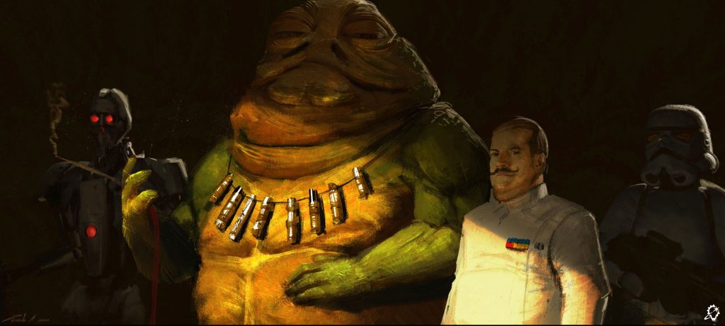 On a lighter note, Moynihan jests about the traits he feels he infused into his Grakkus performance, teasing that his contributions include, “Lumbering movement. Slight back pain and male pattern baldness.” When it comes to Moynihan’s favorite Grakkus attribute that had already been established in the comics, the actor focuses on the collection of Jedi lightsaber hilts the Hutt wears around his neck. “That saber necklace is a STATEMENT PIECE,” Moynihan proclaims.