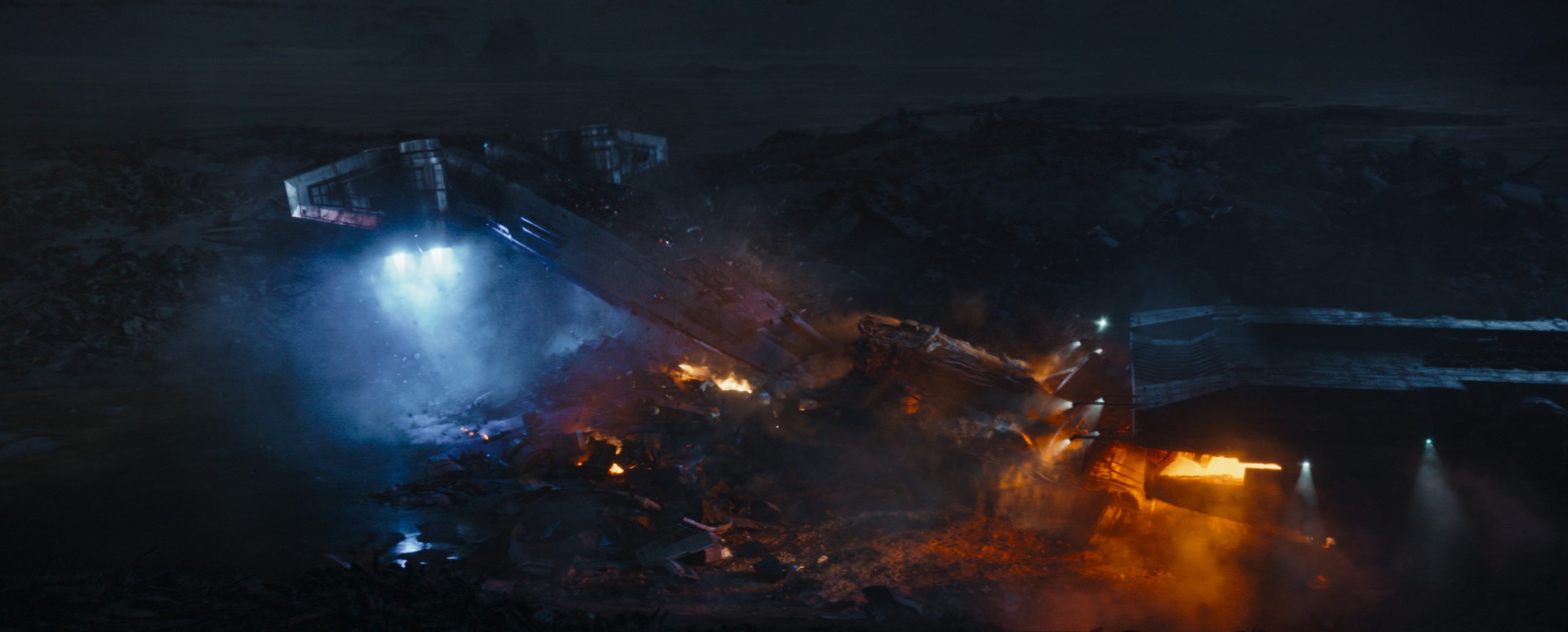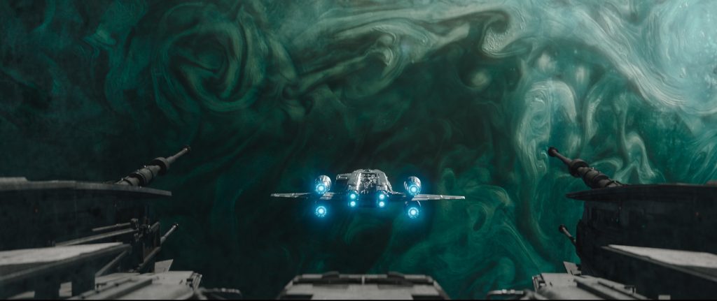 Pirate ships pursue the Onyx Cinder through a toxic swirl of greenish-blue gasses but are destroyed by the satellites. “There’s a lot of heavy, heavy sims [simulations] and work that went into that sequence, and then the landing on At Attin,” Pasquarello says, giving credit to ILM’s compositing and effects teams.