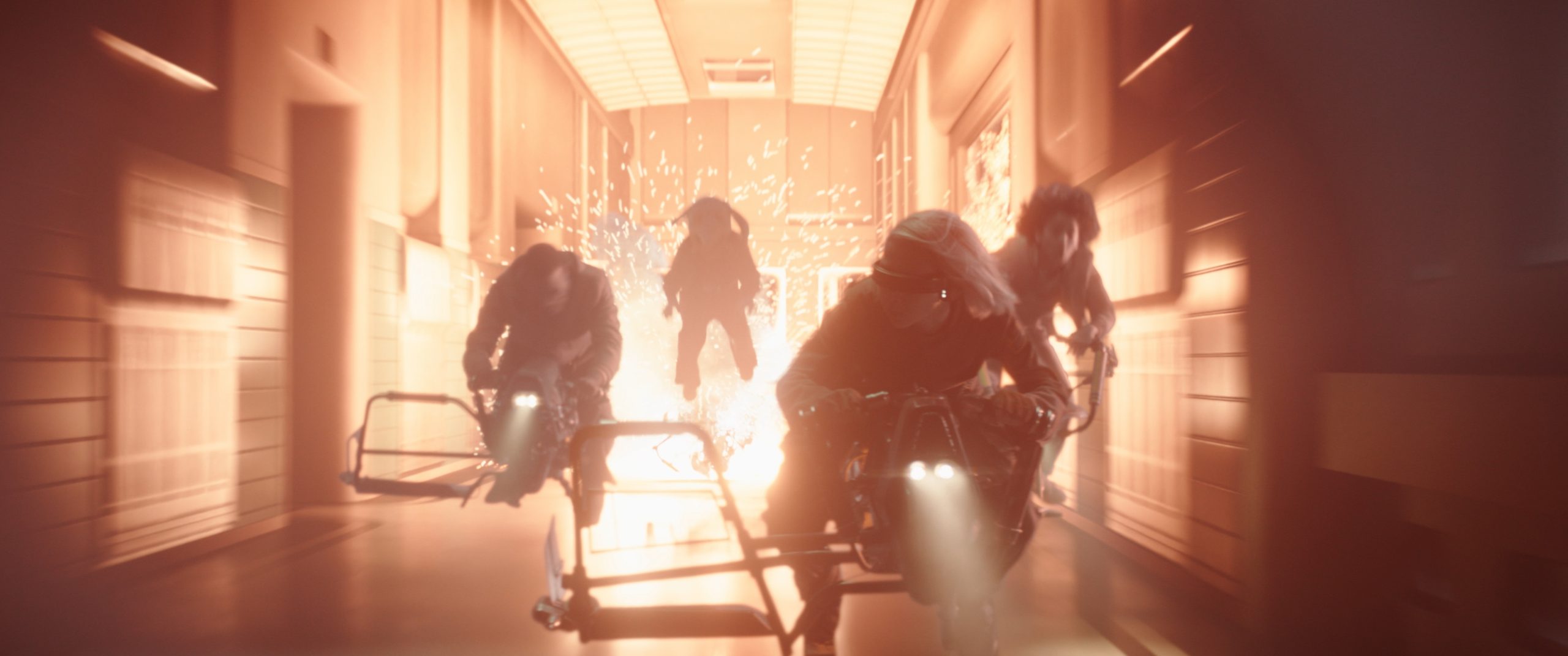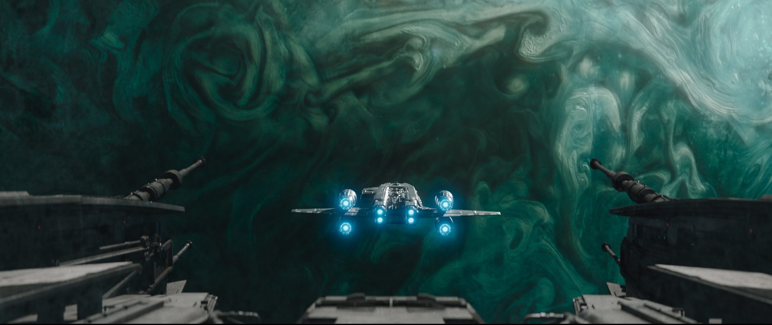 “One of our challenges was that the sleek Onyx Cinder is a cleaner-burning ship,” Pasquarello says. “The whole conceit was that the engines were that orange color because they were dirty and running bad oil. We kept debating: ‘When would it turn blue?’ The sequence is a very elegant transition shot where you see it sputtering away all of that oil and dirt to the cleaner burning blue that we got.”