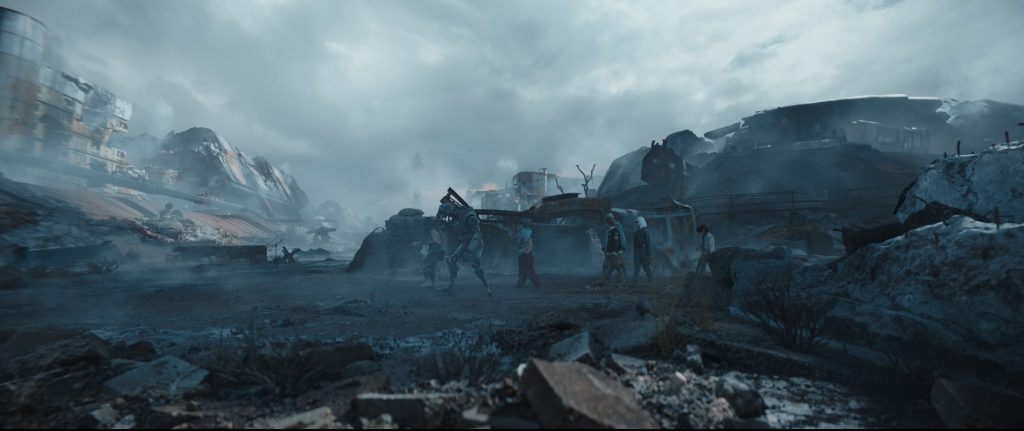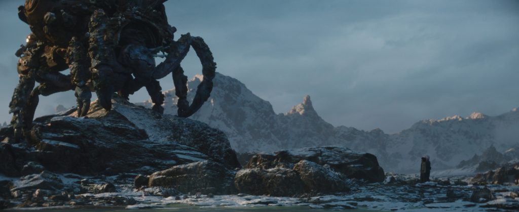 The heroes are challenged by a Troik warlord named General Strix (Mathieu Kassovitz) to prove their strength in battle. In exchange, Strix’s daughter Hayna (Hala Finley) takes them to an abandoned tower that may have the coordinates they need to get home. Inside the tower – another set that utilized the StageCraft volume – SM-33 (voiced by Nick Frost) reveals that his previous captain ordered him to destroy the coordinates to At Attin. Fern attempts to override his memory, triggering a hostile response and transformation sequence that required significant digital work by ILM’s Sydney studio.