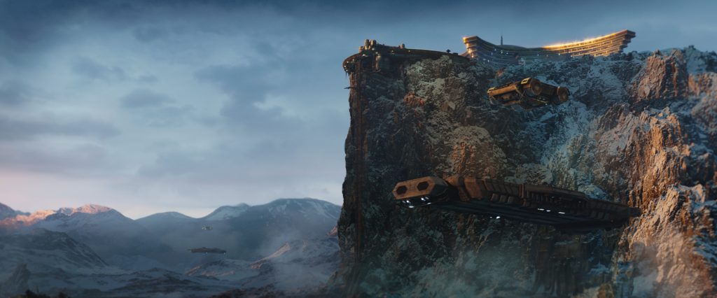 Posing as an emissary from the New Republic, Jod gains access to At Attin’s bountiful treasure: 1,139 subterranean, credit-filled vaults. The vault is an entirely digital environment that DNEG populated with security droids, industrial robotic arms, and a seemingly endless supply of golden computer graphics credits that line the walls and spill into Jod’s rapacious hands.