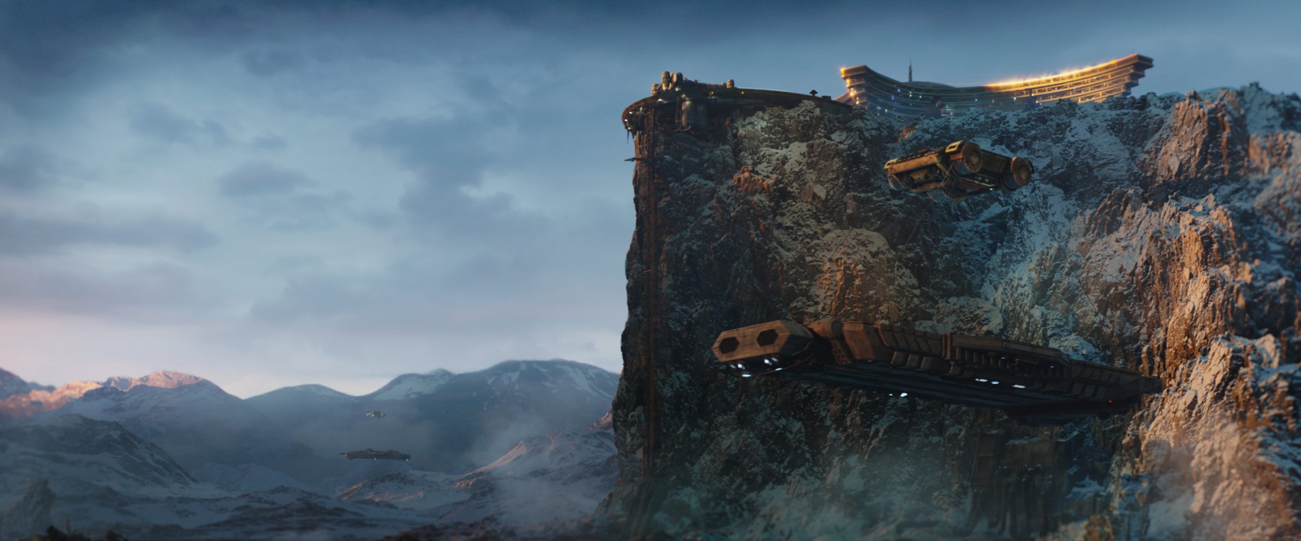 The setting also provides subtle foreshadowing to events that unfold inside the At Attin Supervisor’s Tower in episode eight,” says Pasquarello. “The environment was unique and custom,” he explains. “There’s a deliberate tilt up to the ceiling, and you can see some cables hanging. Those are the remnants of their Supervisor, who’s been totally gutted and ripped out. I think it’ll be fun for people to watch the series again, and they’ll understand.”