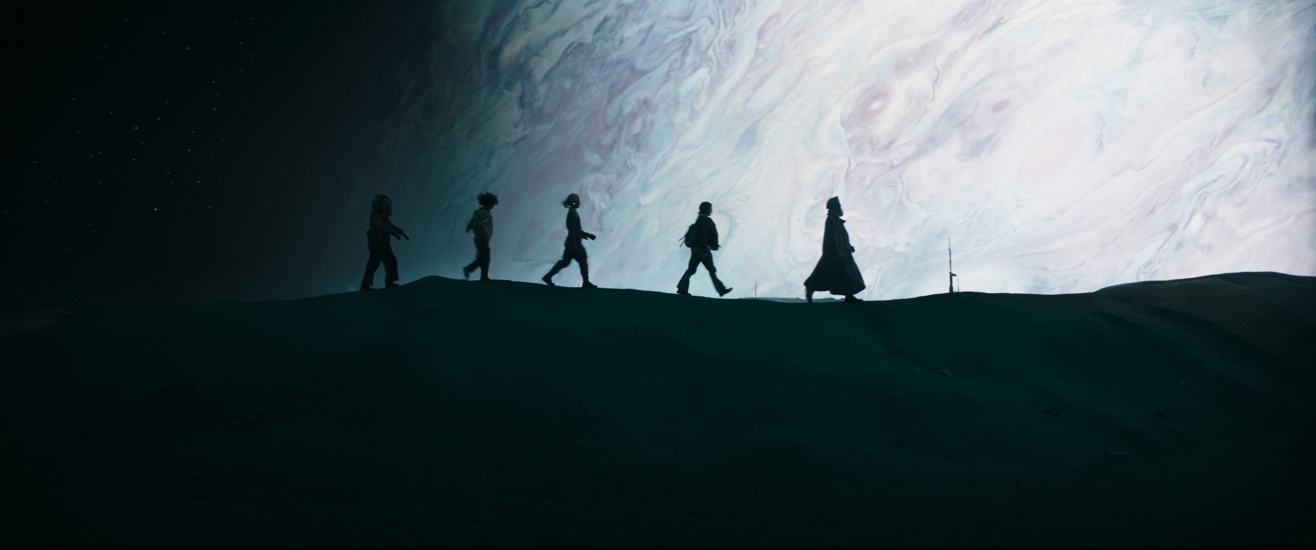 Still searching for At Attin’s coordinates, Jod (Jude Law) and the kids land the Onyx Cinder on the Observatory Moon, seeking help from an alien, owl-like astronomer named Kh’ymm (voiced by Alia Shawkat). The group treks from the ship to the observatory, a striking sequence that includes visuals of the characters silhouetted against a night sky dominated by a nearby planet.