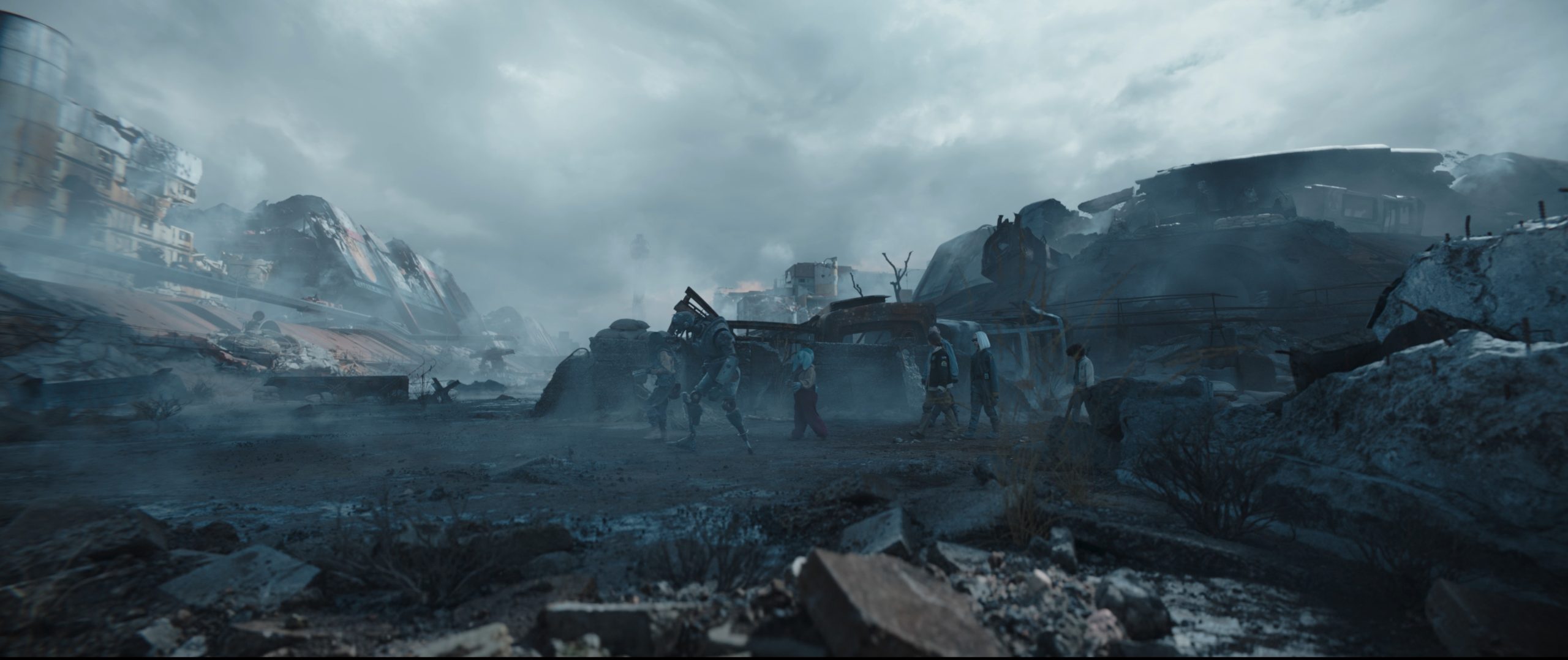The Onyx Cinder arrives at a world that initially looks a lot like At Attin but is actually the conflict-battered sister planet At Achrann, a place where children are trained as soldiers in a war between the Troik and Hattan clans. The kids hike through the decayed remains of a neighborhood and city that once looked like their own. Live-action scenes were shot with minimal sets against blue screen backgrounds and completed with extensive environments created by ILM partner DNEG, including dilapidated buildings and streets, a fully-digital armored assault tank, and a small herd of horned eopie creatures.
