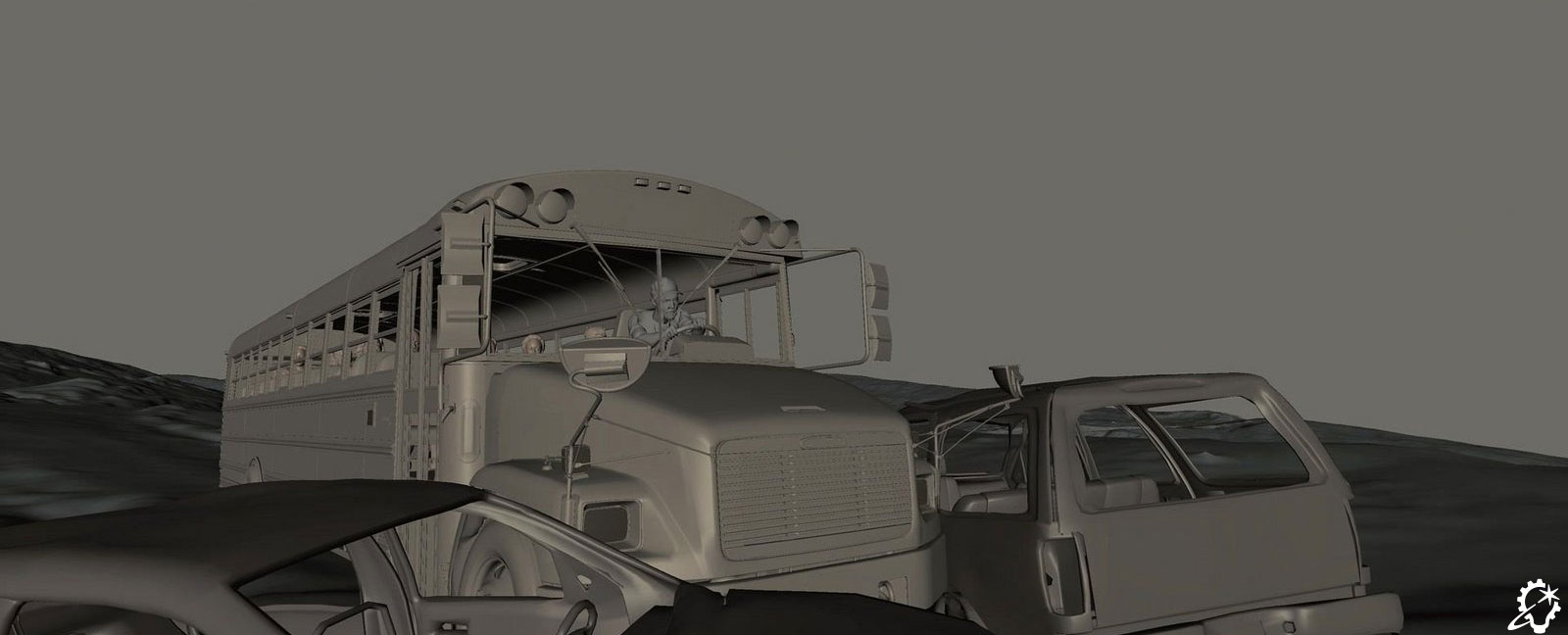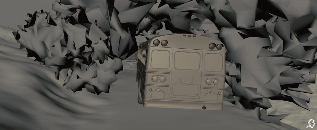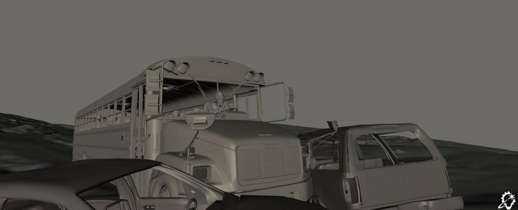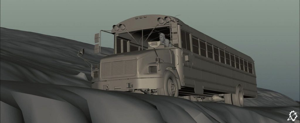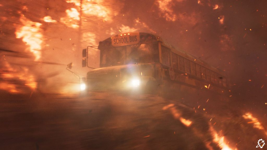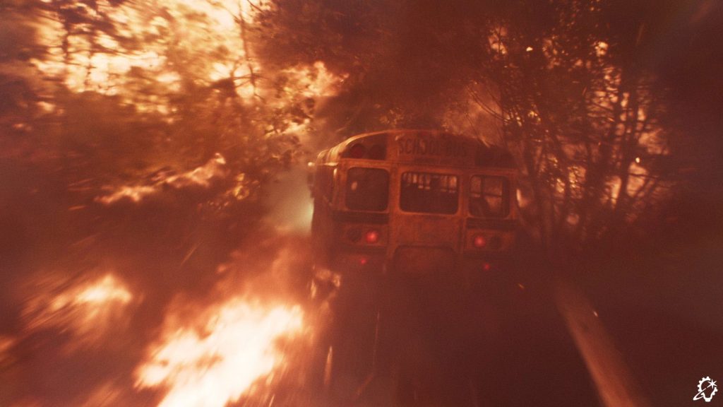 “That shot was an interesting one to put together, to transition from one environment to another, as we did end up needing to go all digital. The daytime section was the same environment we built previously, but because it’s bright out, we had to confirm all the details, like the tree simulations and so on, were there. We put in the CG bus windshield with the wipers, and we had a simulation for the embers. The bus was splatting into the embers, and due to the speed of the bus, the embers sort of floated to the side and got caught underneath the windscreen wiper. All of these details helped convey the sense of travel.”