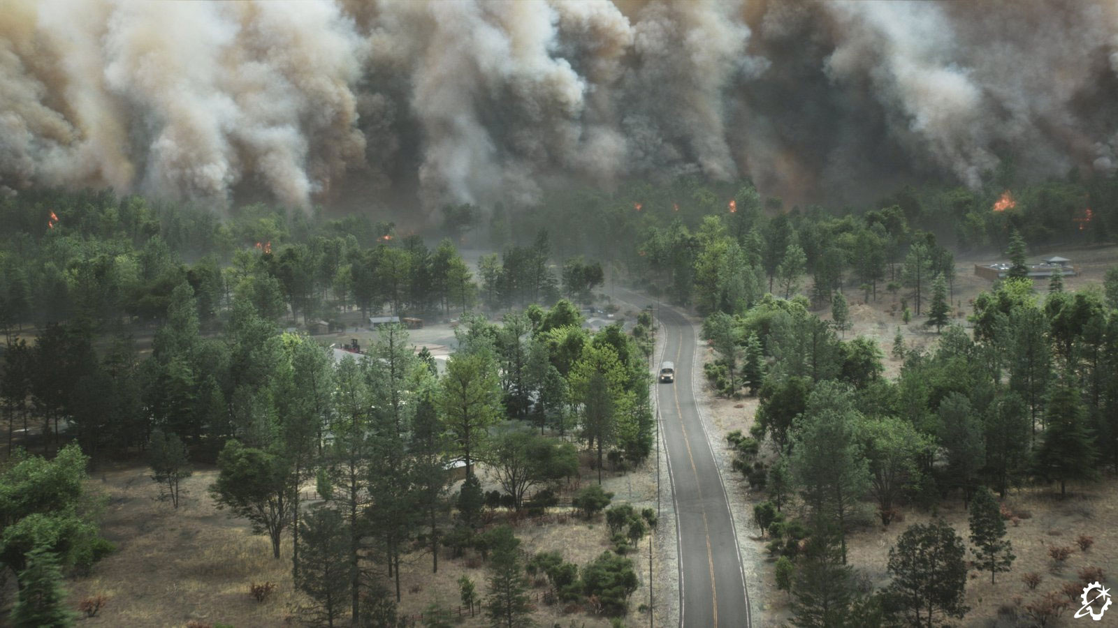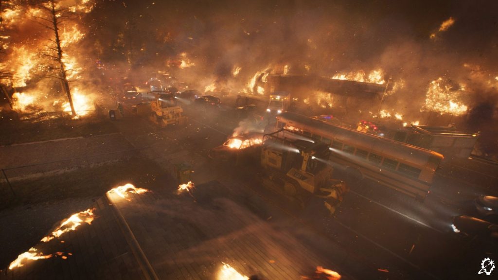 ILM broke up the reference megaclip into separate asset types. “We had shots within the smoke cloud, shots outside of the smoke cloud, big fires, small fires, brush fires, trees burning, houses burning, and cars burning,” Zaretti recalls. “There were fire tornadoes; I didn’t even know that was a thing! We were spoiled with references to the point where the references began to contradict each other because there’d be wind blowing in two different directions in the same piece of footage. Those contradictions actually helped us in certain scenarios. For example, during the escape sequence when the bus is winding down this thin road, there are points where we had flames licking at it from both directions to portray the danger that they were in. So, having a real reference to back up your visual effects often helps.”