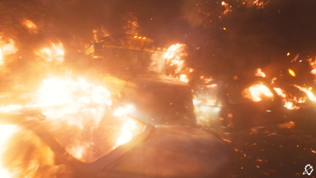 The abundant reference footage proved incredibly useful; although, its varied nature also meant ILM needed to build a wealth of digital assets to fully represent the range of material. “We had about seven types of fire assets,” Zaretti says of the meticulous process. “You’d think fire would count as one thing, but no, we had small, medium, and large fires. We had traveling fire that was needed to show the spread of fire through the grass. There were several types of smoke because vegetation has a lighter smoke, while houses and cars have a darker, roiling, inky smoke.” Surprisingly, minute embers seen amidst the chaos are burning or smouldering pine cones, reflecting the heavy debris encountered throughout the 2018 fire.