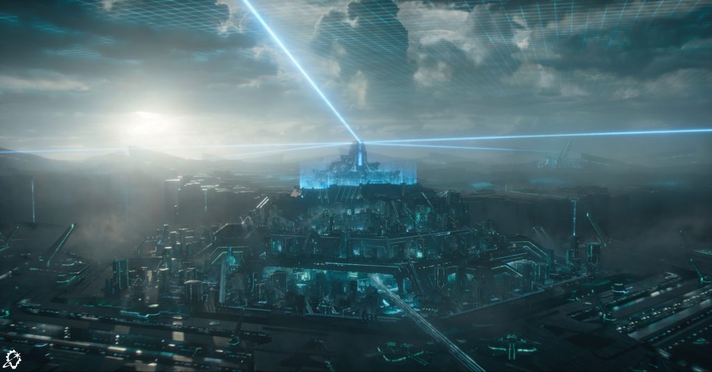 Capogreco broadly summarizes the delegation between sites, stating, “Vancouver covered the bluer and sleeker Encom Grid, and they owned the light cycle chase and the majority of the city work. On the other hand, in terms of the real world, Sydney had the mountain test site and the printing of the orange tree, as well as a substantial number of shots coming and going from the Grids. ILM’s Sydney studio was also involved with everything around the Dillinger Grid, even the on-set segment where partial sets were built. To film, they had to poke lights into the set, so we’d go in to top up the shots by augmenting roofs, set extensions, and other small cosmetic fixes here and there.”