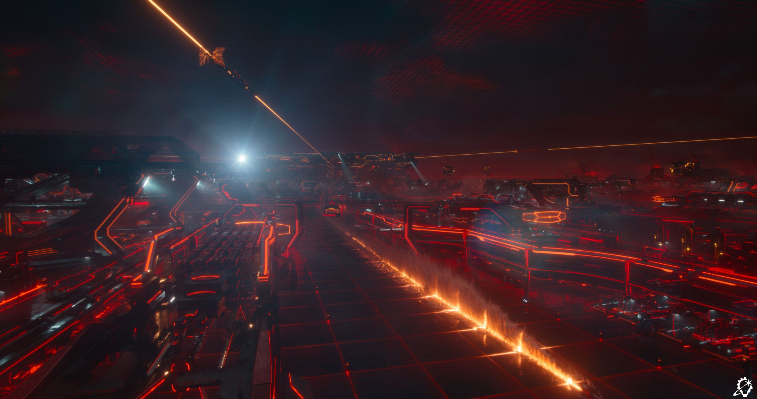 Seeking to furnish the Grid with “scale and purpose,” Capogreco researched ports and military facilities as a way to subtly infuse features that would cause audiences to recognize distinct areas, such as factories and military zones, within the Dillinger Grid.