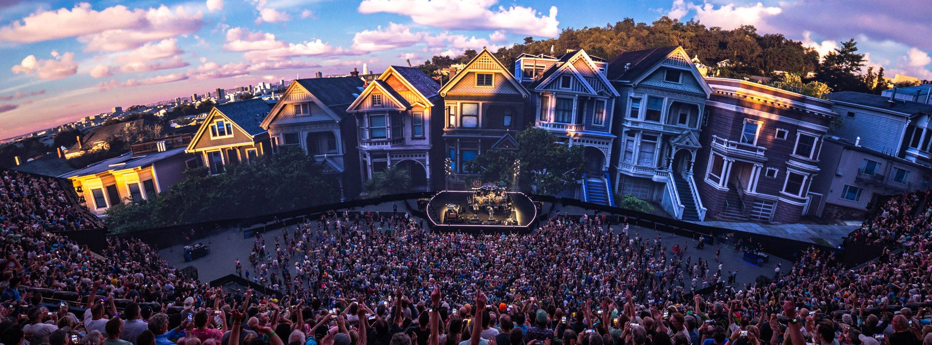 A massive scaffolding on the 160,000 square feet wrap-around screen opens up creating the band’s iconic lightning bolt symbol and reveals a current-day view of 710 Ashbury Street, the original home of the Grateful Dead. In a moment that takes the audience by surprise, the camera slowly begins to rise to a wider San Francisco skyline, punctuated by a gasp when we travel through clouds and beyond Earth’s orbit to the Milky Way.