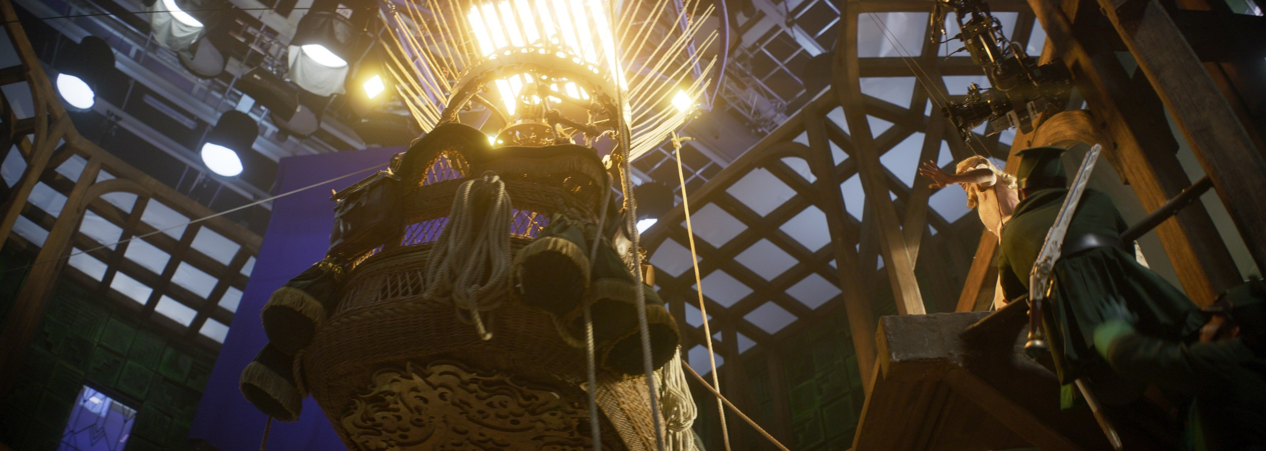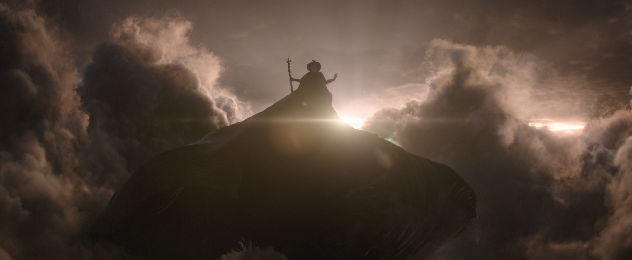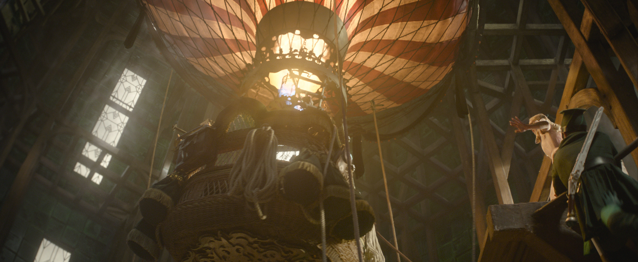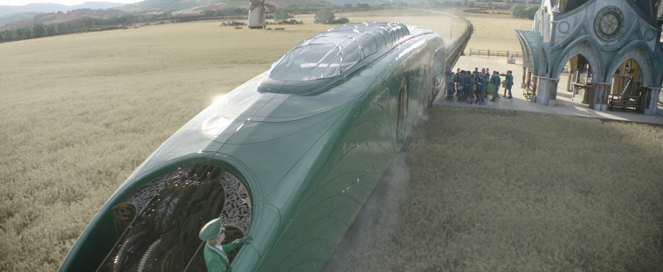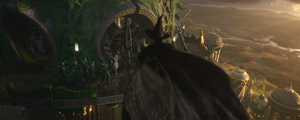 Helman also highlights Elphaba’s emotional arc in her final scene through the use of light and symbolism. “You start from the bottom in the darkness towards the light and you go out on the balcony towards the sun, and then the sun starts coming down throughout that sequence towards the end of the movie. If you have seen the play, you know that at the end of the first act, the cape gets bigger and bigger. So the question is, how do we translate that? Do we do it? Is it going to be laughable? The cape is a visual effect, because we couldn’t use a real one due to the wires. Throughout that sequence, everything becomes pictorial. And by the time we get to that shot, basically, it’s a spiritual, religious picture. The clouds are very Renaissance Italian, with the sun behind them and there’s all kinds of volume shadows and volume light coming through. And then all of a sudden you realize, oh my goodness, the cape is huge. What happened? Are you inside her mind, or is that a literal thing? Probably not. And then she does the war cry and the camera pulls back out and you think the movie ends, but she turns around and goes away flying. And then the audience is thinking, ‘wait, wait, where are you going?’ Then the movie ends to get them ready for part two.