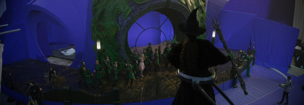 Unlike directors who rely heavily on previsualization, Chu prefers a more fluid, organic approach, embracing spontaneity throughout the filmmaking process. “He doesn’t use pre-vis the way some directors do,” Helman says. “We’d sit at a table with the heads of department, with Alice Brooks (Director of Photography), Myron Kerstein (Editor), with Nathan Crowley (Production Designer), Paul Corbould (Special Effects Supervisor), Jo McLaren (Stunt Coordinator) with a model of the set for that scene. And then we give him a little stick with a little Elphaba and other characters and he goes in and shows us what the scene is about. And when there is music, he plays the music from his phone. Then he does the movement of the actors with Chris Scott, the choreographer. And so we video those sessions and then we all go away and try to figure out how we’re going to achieve Jon’s vision—between all of us.
